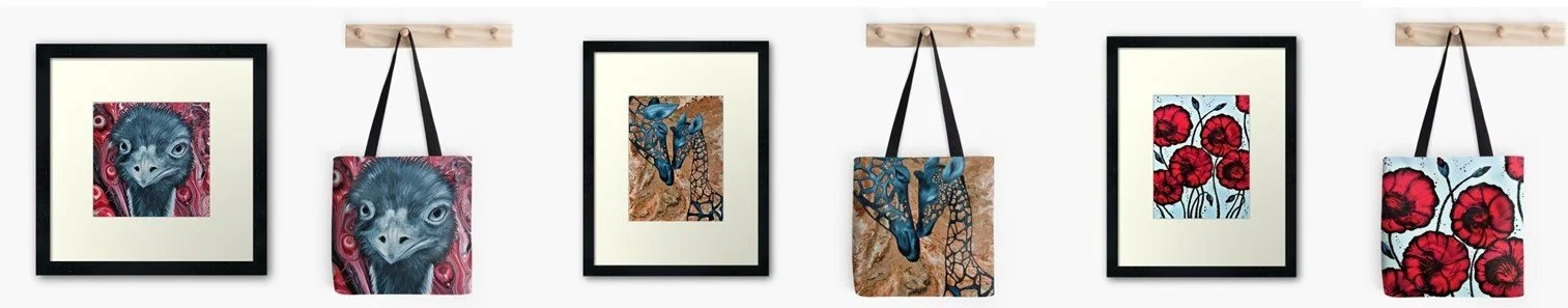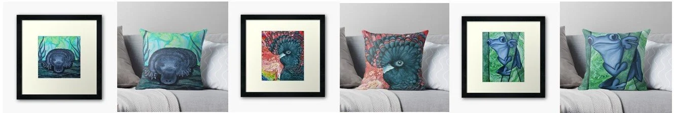 All our original artworks are available as print on demand products. Including cushion covers, mugs, coasters, tote bags, sarongs, T shirts, scarfs, stickers and much more SHOP NOW